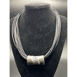 Black multi strand necklace with treated cord silvertone filigree rhinestone pendant