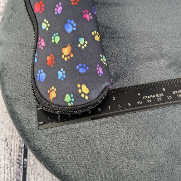 Black neoprene zippered glasses sunglasses case clip, rainbow colored paw prints