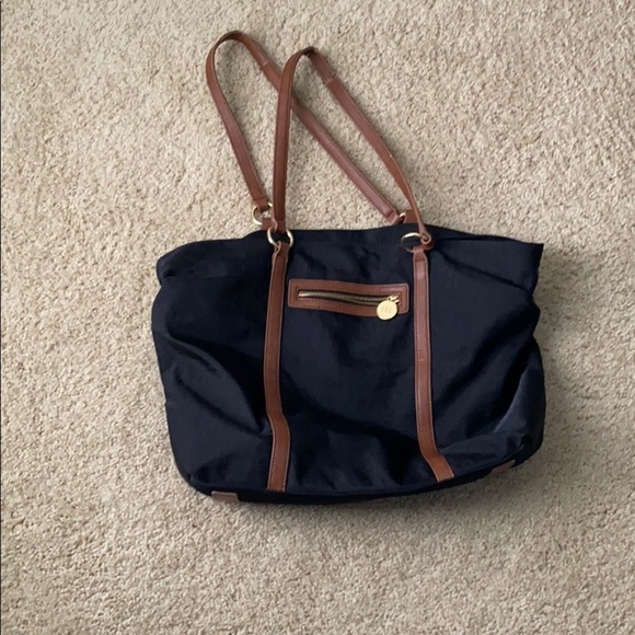 Black nylon tote with zipper pocket inside and zipper closure. Tan handles, leather. The tote is in great condition and has lots of use left. The nylon is in almost perfect condition. The leather is straps are as shown. Outer zipper pocket. Smoke-free home.