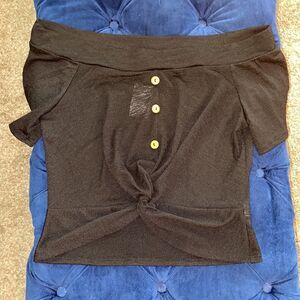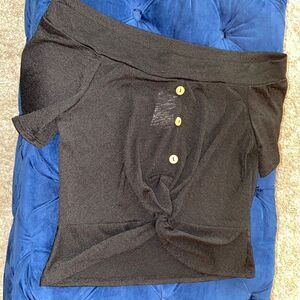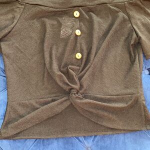 Has cute wooden buttons and twist front. Size L. 95% polyester, 5% spandex.