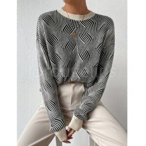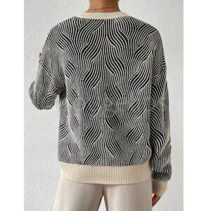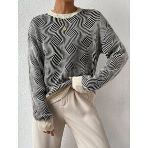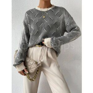Black on Beige Textured Pullover Knit Long Sleeve Sweater