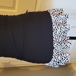 Chic and stylish black apt 9 bathing suit. Bathing suit has ruffled white with black detail skirt around bottom of suit and halter tie on top. Very flattering! Never worn, tags and panty guard still attached. Perfect condition!