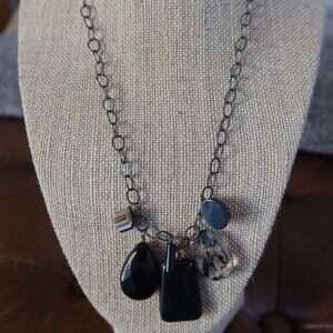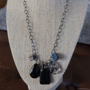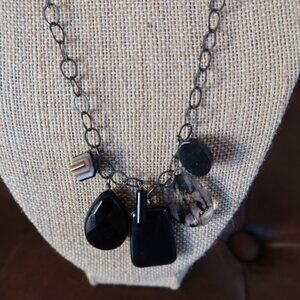 Pretty and unique pendant with large teardrop shaped black onyx bead and 5 other beads either black or white/clear with black on a sterling silver chain