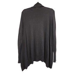 Description: Long sleeve open front black cardigan with rounded bottom that hits mid thigh.