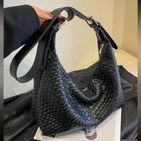 Vegan Leather Black or Brown Soft Weave Vintage Style Large Capacity Casual Shoulder Bag with Adjustable Shoulder Strap.