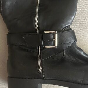 Stylish black knee-high leather boots featuring silver zippers and buckles. Perfect for a chic look.