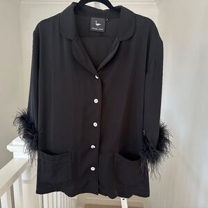 Elegant black feather trim button up top and pull on bottoms pajama set. feather trim on cuffs and pajama pants hem. Perfect for a cozy night in. Never worn. Feather cuffs are removable for laundering.
