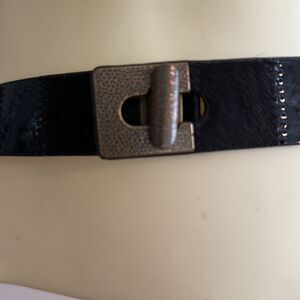 Black patent & faux fur adjustable belt with unique bronze buckle