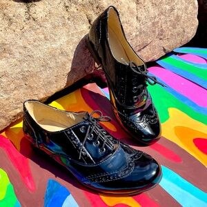 70s wingtip oxford black patent leather lace up shoes. Leather is pealing on right shoe so selling for less. Women’s size 6 by D’Juliana.