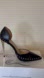 Black patent leather, closed pointy toe, with gold detailing, 4” heel. 8.5