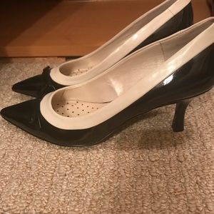 Anne Klein size 7.5 Iflex black patent leather kitten heels with off white/ lightcream trim and bow detail on front. Never worn excellent work shoes
