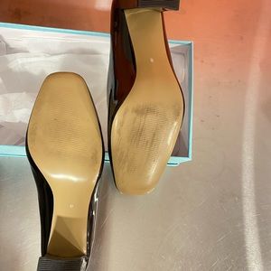 Like new black patent leather heels. Size 8, feels like 8 1/2, worn for 45 minutes just too big for me. Slight scuff on front outside right shoe. If fit correctly they are comfortable.