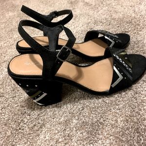 These are adorable black patterned heels (approx. 2 inches). Only worn one time for a charity event. They are black, silver and olive green Size 7.5