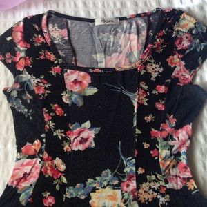 Black peplum shirt with flower patterns.