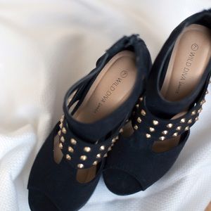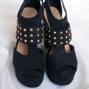 This is a gorgeous pair of black faux suede platform wedges featuring cutouts and studded detailing. I purchased these from Charlotte Russe and only wore these a couple of times. They are in very good condition and are quite comfortable to wear.