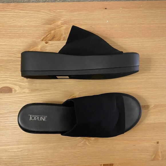 Black, platform, wedge fabric slide shoe. Platform height 1.75 inches, Open Toe. Size 10. Never used and in original packaging. Comes from a smoke-free home. This is a flattering and comfortable summer shoe perfect for the beach or festival season.