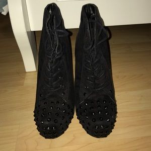 All black suede platform heels with small spikes at the toe front. Perfect for a night out and very comfortable as well!