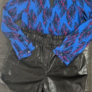 Black pleather shorts. Slight stretch, soft material. Shorts comes with blouse!
