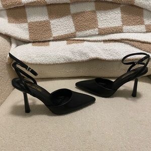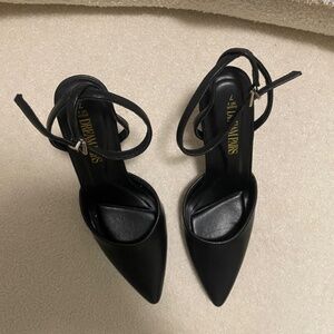 Black pointed toe heels with strap