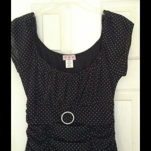 Black with white polka dots, cap sleeves and ruffled bottom and rhinestone buckle at the waist