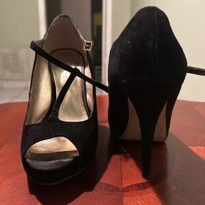 Suede black heels with good hardware, thick sole, slightly worn out. Vintage