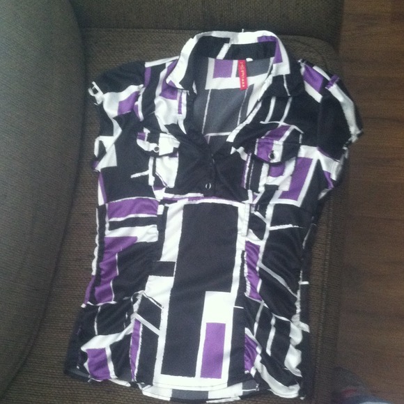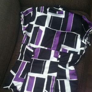 This is a satin multi-colored blouse with double breast pockets and blended in belt loops. Would look great with a black belt or without. XL but fits like a L