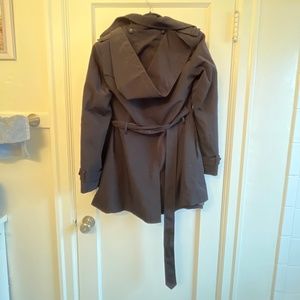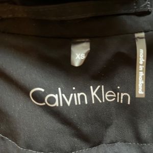Black Calvin Klein raincoat with removable insulated layer, double breasted coat buttons, hood.