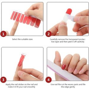 full nail wraps are featured with self-adhesive, you just need to apply the desired nail sticker directly to you nail and cut it to fit your nail well, and then, use the nail file (included) to file the edges gently to make it smooth, simple to operate and remove