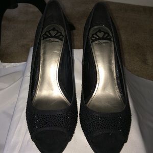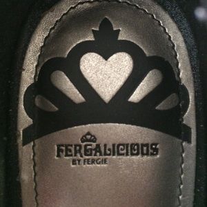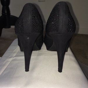 These super glam heels are Fergalicious by Fergie. Black rhinestones fully cover top half of shoes. Velveteen material on the rest. Heel measures Approx. 4" with 3/4" platform. Worn once- only flaw is small knick in left heel (see picture) no scuffing on bottoms. 👠📦 Box not included