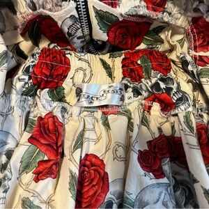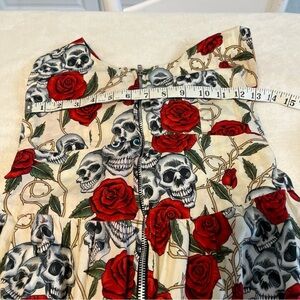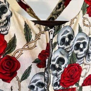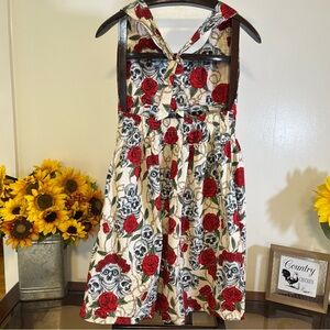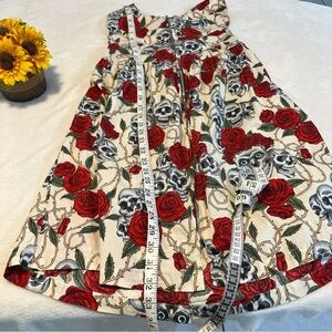 Elevate your summer wardrobe with this stunning Black Roses halter dress. Perfect for any occasion, this dress features a beautiful floral pattern with skulls and roses accents. The sleeveless design and knee-length cut make it a great choice for a day out in the sun, while the 100% cotton material ensures comfort and breathability.