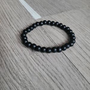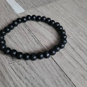 Black round beaded bracelet stretchy elastic, I'm not sure what the material is it's probably plastic of some kind. no signs of wear or damage.