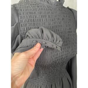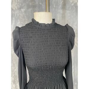 Black WAYF blouse that features a fully smocked bodice, peplum, princess cut sleeves that puff at the top with extra structure and taper at the wrist with a button detail. Frilly neckline. Very stretchy and flattering. Can be dressed up or down. Size small.