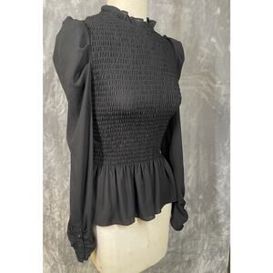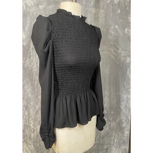 Black ruched smocked long sleeve top peplum frilly neck WAYF blouse victorian