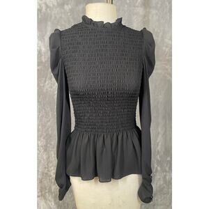 Black ruched smocked long sleeve top peplum frilly neck WAYF anthro Small blouse