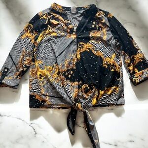 Black ruched top. It flatters the waist and the chest, I mean it just flatters all your parts. Find out for yourself! Pairs well with a skirt or jeans for any season. Going to a bar? Wear it. Going to Netflix and chill? Wear it...but take it off at some point for that.