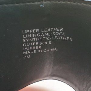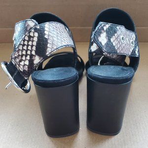 Black leather sandals with snakeskin strap in back, buckle closure on strap, 4" heel, size 7. Excellent condition.