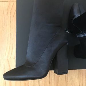 Black satin booties. Heel is almost 4.25 inches. Inside zip. Was at Saks fifth avenue for $175. Luxe block heel. Textile upper and lining. Side zip. No trades. Please reach out with any questions. Bundle with other things to save. 😊New with box GREAT GIFT.
