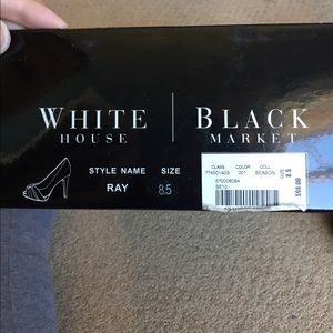 VGUC White House Black Market peep toe 4.5 inch heels, with 1/2 inch platform. Nicely padded leather soles. Flawless satiny fabric upper with pretty bow-look peep toe. Small white scuff on back of one heel, see photo. Could probably cover it with Sharpie. These are 8.5, but run large. I usually wear 9 in flats, and these are a hair big on me. Only worn a couple times because of that. Original box included. From smoke & pet free home. No transactions off Posh.