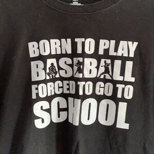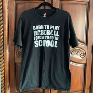 Black t- shirt with screen print “Born to play baseball Forced to go to school” Men’s large EUC