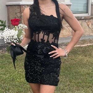 Black sequin Juliet dress (one shoulder). Size 2. Worn once for 4 hours. Dress is hemmed as shown in 1st and 2nd picture. Original detail shown in 3rd picture if hem is removed. Dress was not cut when altered. Smoke free and per free home. Let me know if any questions.