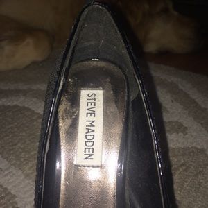 Black Sequin heels from Steve Madden that were lightly used and don't fit me anymore. The inside of the right shoe where your heel sits is slightly scuffed from being worn but still looks good.