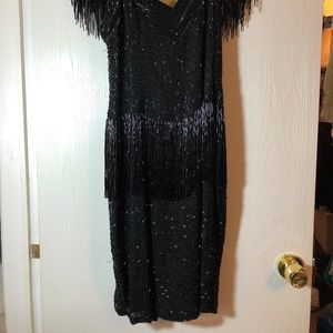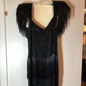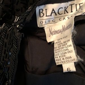 BlackTie by Oleg Cassini sequined cocktail dress. Size 6, black 100% silk outer sheath with matching rayon lining. Very flattering, timeless design. Open back with hook and zippered closure. Fits size 4-6.