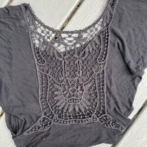 Black sheer crop top flutter sleeve crochet back dELiA's whimsigoth Y2K boho