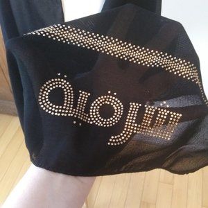 Black sheer scarf with gold rhinestone embellishment on one edge Made in Kuwait