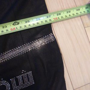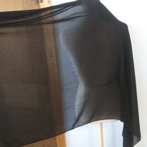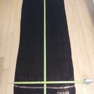 Black sheer scarf with gold rhinestone embellishment on one edge Made in Kuwait . Measurements : ~70" x ~ 27". No material content tag or care instructions . The gold rhinestone embellishments looks like an Arabic word . I Asked a FB Arabic language group and they said it said Asian or oriental but I have no real idea as I do not speak or read Arabic. Questions are always welcome .