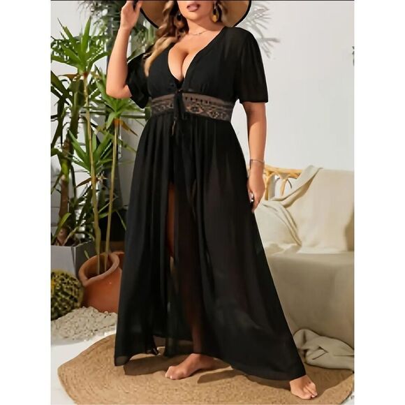 Black sheer lace tulam kimono coverup duster dress robe nwt 2xl fits plus
