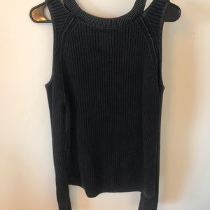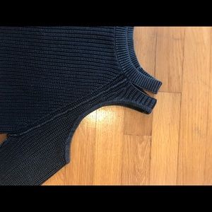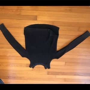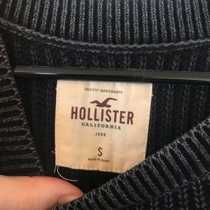 This is a long sleeve knit black sweater it has two shoulder cutouts on both arms for a little added sass. In true Hollister fashion the arms are long and snug fitting. Small slits on both sides of the torso.
