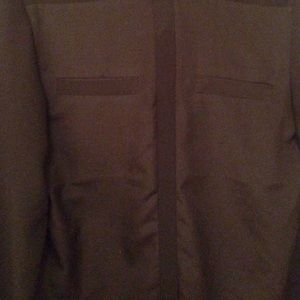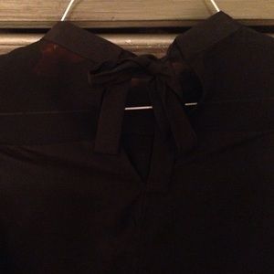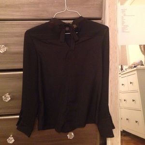 This black silky top is simple but has some really cute features. It has a tie in the back, faux pockets on the front and cuffed sleeves. Looks great with a colored pencil skirt. The sleeves and top of the shirt are a more sheer material and the rest is more silk. Perfect condition.