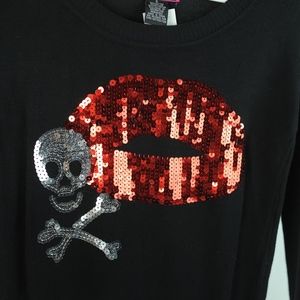 Black long sleeve sweater with silver sequined skull & crossbones and red sequined Lips. Sweater is soft 52% cotton, 28% rayon, 20% poly blend. New with tags. Chest - across. Cute rocker wear!