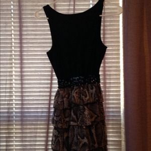 Black dress with snake skin pattern at bottom. Tight at top, lose at bottom. Above knee length. Great condition!